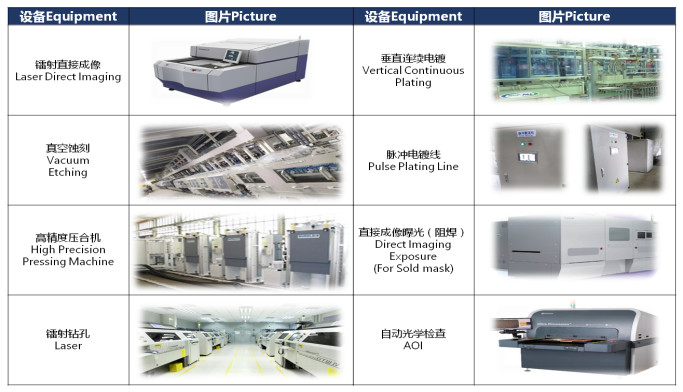 § 设备:压机、镭射五代机、VCP填孔、全制程DI设备、真空蚀刻等业界高端主流设备。